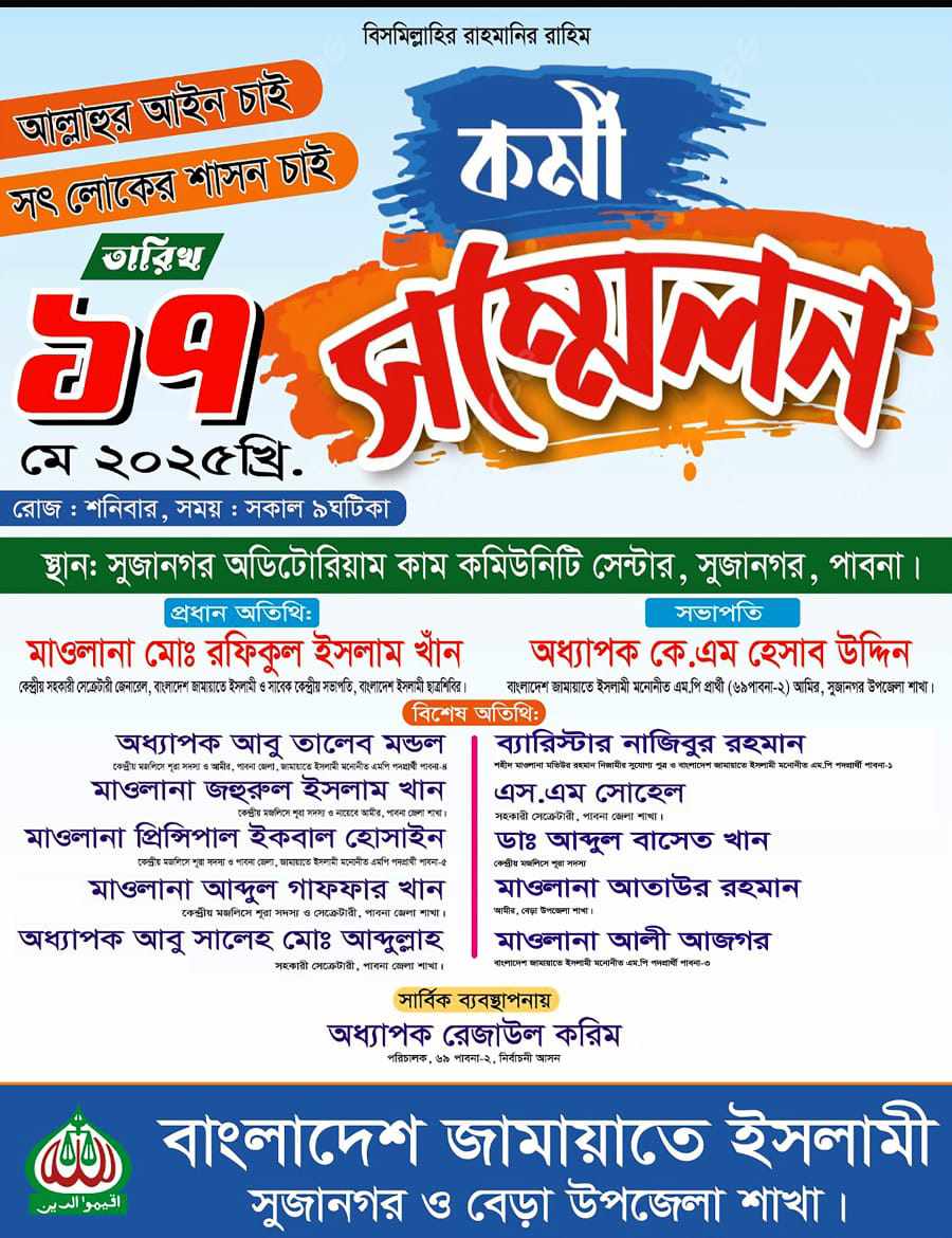 আগামীকাল শনিবার (১৭ মে ২০২৫ ইং) পাবনার সুজানগর উপজেলা জামায়াতে ইসলামীর আয়োজনে স্মরণকালের বিশাল কর্মী সম্মেলনের আয়োজন করা হয়েছে।