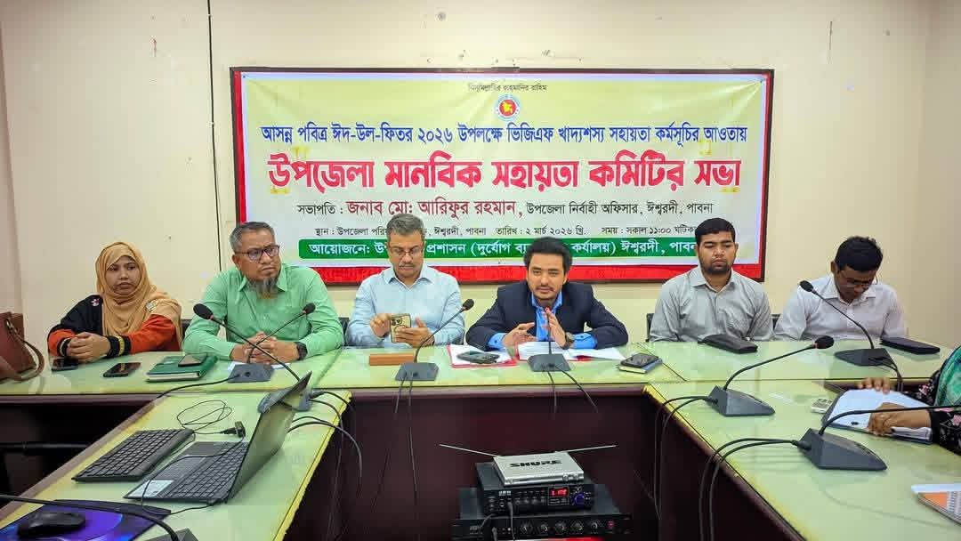 আসন্ন পবিত্র ঈদুল ফিতর উপলক্ষে ভিজিএফ খাদ্যশস্য সহায়তা কর্মসূচি সুষ্ঠু ও স্বচ্ছভাবে বাস্তবায়নের লক্ষ্যে ঈশ্বরদী উপজেলা মানবিক সহায়তা কমিটির সভা অনুষ্ঠিত হয়েছে। সোমবার (২ মার্চ) দুপুরে উপজেলা মিলনায়তনে আয়োজিত সভায় সভাপতিত্ব করেন উপজেলা নির্বাহী অফিসার (ইউএনও) মো. আরিফুর রহমান। সভায় আসন্ন ঈদকে সামনে রেখে দরিদ্র ও অসহায় পরিবারের মাঝে সরকার ঘোষিত ভিজিএফ খাদ্যশস্য বিতরণ কার্যক্রম যথাযথভাবে বাস্তবায়ন, তালিকা প্রণয়ন ও বিতরণে স্বচ্ছতা নিশ্চিত করার বিষয়ে বিস্তারিত আলোচনা করা হয়।উপজেলা প্রকল্প বাস্তবায়ন কর্মকর্তা সেহাব উদ্দিনের সঞ্চালনায় সভায় বক্তব্য রাখেন উপজেলা স্বাস্থ্য ও পরিবার পরিকল্পনা কর্মকর্তা ডা. আলী এহসান, উপজেলা জামায়াতে ইসলামীর আমির ডক্টর নুরুজ্জামান প্রামানিক, জাতীয়তাবাদী মহিলা দলের উপজেলা সাধারণ সম্পাদিকা মাহরুফা আক্তার চামেলি প্রমুখ। বক্তারা বলেন, ঈদুল ফিতরকে সামনে রেখে সরকারের এ মানবিক সহায়তা কর্মসূচি যাতে প্রকৃত উপকারভোগীদের হাতে পৌঁছায়, সে বিষয়ে সকলকে আন্তরিক ও দায়িত্বশীল ভূমিকা রাখতে হবে। কোনো ধরনের অনিয়ম বা স্বজনপ্রীতির অভিযোগ এড়াতে স্থানীয় জনপ্রতিনিধি ও সংশ্লিষ্টদের সমন্বিতভাবে কাজ করার আহ্বান জানানো হয়।