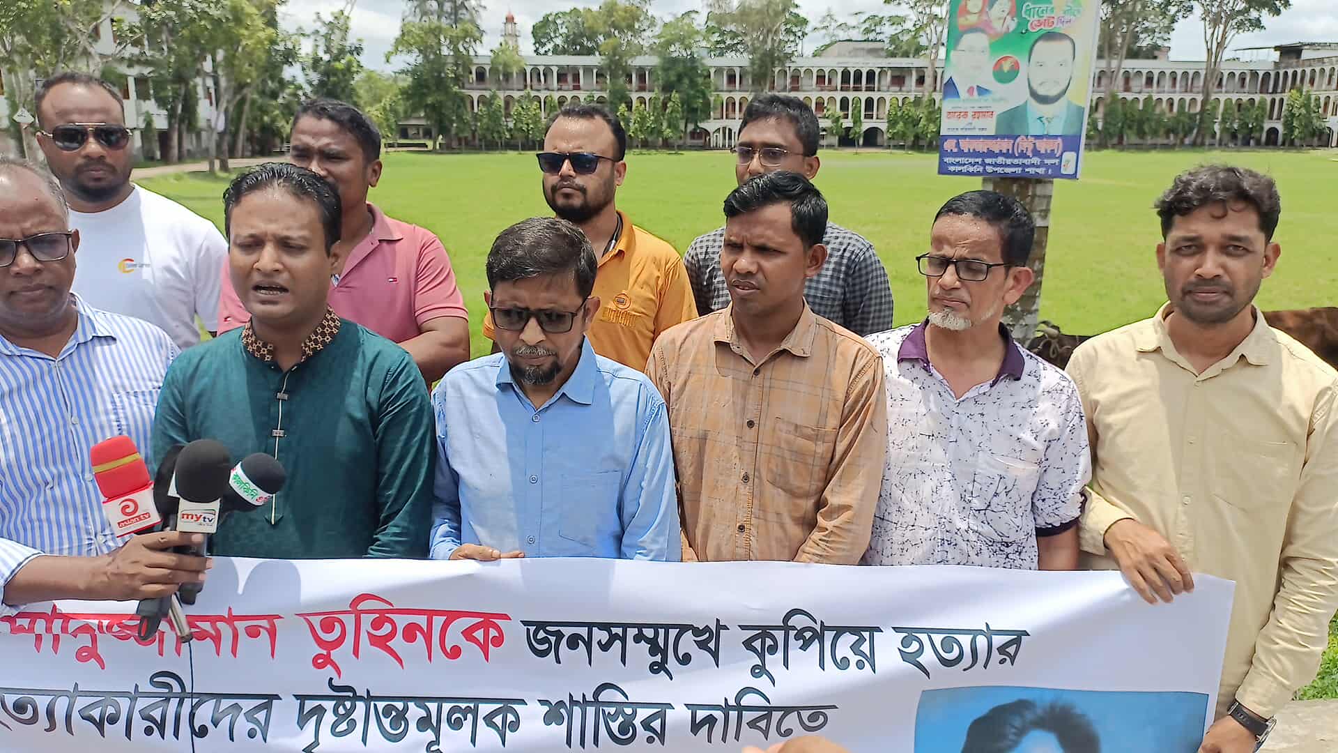 গাজীপুরে প্রকাশ্যে নির্মম হত্যা সাংবাদিক আসাদুজ্জামান তুহিনের হত্যার প্রতিবাদে মাদারীপুরের কালকিনি ও ডাসার উপজেলায় কর্মরত সকল সাংবাদিকদের উদ্ধোগে মানববন্ধন ও প্রতিবাদ সমাবেশ অনুষ্ঠিত হয়েছে গাজীপুর মহানগরীর ব্যস্ততম চান্দনা চৌরাস্তার মসজিদ মার্কেটের সামনে বৃহস্পতিবার (৭ আগস্ট) রাত ৮টার দিকে কুপিয়ে ও গলা কেটে নির্মমভাবে হত্যা করা হয় সাংবাদিক আসাদুজ্জামান তুহিনকে (৩৮)। তিনি ‘দৈনিক প্রতিদিনের কাগজ’-এর স্টাফ রিপোর্টার ছিলেন আসাদুজ্জামান তুহিন হত্যার প্রতিবাদে মাদারীপুরের কালকিনি ও ডাসার সকল সাংবাদিকদের ব্যানারে একটি মানববন্ধনের আয়োজন করা হয়।শনিবার বেলা ১২:০০ঘটিকার সময় কালকিনি সৈয়দ আবুল হোসেন বিশ্ববিদ্যালয়ের সামনের সড়কে এ মানববন্ধন ও প্রতিবাদ সমাবেশ অনুষ্ঠিত হয়।মানববন্ধনে উপস্থিত ছিলেন কালকিনি ও ডাসার উপজেলা যুগান্তরের প্রতিনিধি এইচএম মিলন, ঢাকা প্রতিদিন ও রুপালী বাংলাদেশের প্রতিনিধি নাসির উদ্দিন লিটন, জনকন্ঠের সাংবাদিক জাফরুল হাসান, আনন্দ টিভির জেলা প্রতিনিধি মম হারুন অর রশীদ, দৈনিক সংবাদ কালকিনি প্রতিনিধি আশরাফুল রহমান হাকিম,এশিয়ান টিভির কালকিনি প্রতিনিধি শাহজালাল সরদার, মাইটিভির প্রতিনিধি শেখ লিয়াকত ও একুশে টিভির সাংবাদিক মো. রকিবুজ্জামান, স্বদেশ প্রতিদিন কালকিনি প্রতিনিধি সাহাদাত ওয়াশিম, , চ্যানেল এস এর কালকিনি প্রতিনিধি ইব্রাহিম সবুজ, বিজয় টিভির বিশেষ প্রতিনিধি সৈয়দ মারুফ, দিনকালের কালকিনি ও ডাসার প্রতিনিধি, বাংলাদেশ বুলেটিনের কালকিনি প্রতিনিধি, আমার দেশের প্রতিনিধি খন্দকার শামিম, নিরপেক্ষ কালকিনি প্রতিনিধি সৈয়দ শামীম, প্রতিদিনের সাংবাদের মেহেদী হাসান, আজাহারউদ্দিন, আমার সংবাদ কালকিনি প্রতিনিধি রাজু আহম্মেদ, প্রতিদিনের বাংলাদেশের রাজীব আহমেদ, আজকের দরর্পন ইস্তিয়াক, যায়যায় কালের আজাদ সরদার, মাদারীপুর সংবাদের কালকিনি প্রতিনিধি আব্দুস সালাস ও সাংবাদিক মাহফুজর রহমান ইমরানসহ উপজেলার সকল প্রিন্ট ও ইলেকট্রনিক মিডিয়ার সাংবাদিকবৃন্দ। এ সময় বিভিন্ন গণমাধ্যমে কর্মরত সাংবাদিকরা বলেন, “চাঁদাবাজি ও দেশীয় অস্ত্রের মহড়ার ভিডিও ধারণের কারণে তুহিনকে হত্যা করা হয়েছে, যা স্বাধীন সাংবাদিকতা ও মতপ্রকাশের অধিকারকে সরাসরি আঘাত করেছে।” সাংবাদিক সুরক্ষা আইন করার দাবি ও সাংবাদিক তুহিনের পরিবারের দায়িত্ব এ সরকার কে নেয়ার আহ্বান জানান বক্তারা। তারা আরও বলেন, “২০২৪ সালের গণঅভ্যুত্থানের পর দেশের আইনশৃঙ্খলা পরিস্থিতি অত্যন্ত দুঃখজনক এবং সাংবাদিকদের নিরাপত্তা নিশ্চিতে রাষ্ট্র আন্তরিক নয়।”সমাবেশ শেষে সাংবাদিক ‘তুহিন হত্যার বিচার চাই’ সাংবাদিকদের নিরাপত্তা চাই স্লোগান দিয়ে উপজেলার বিভিন্