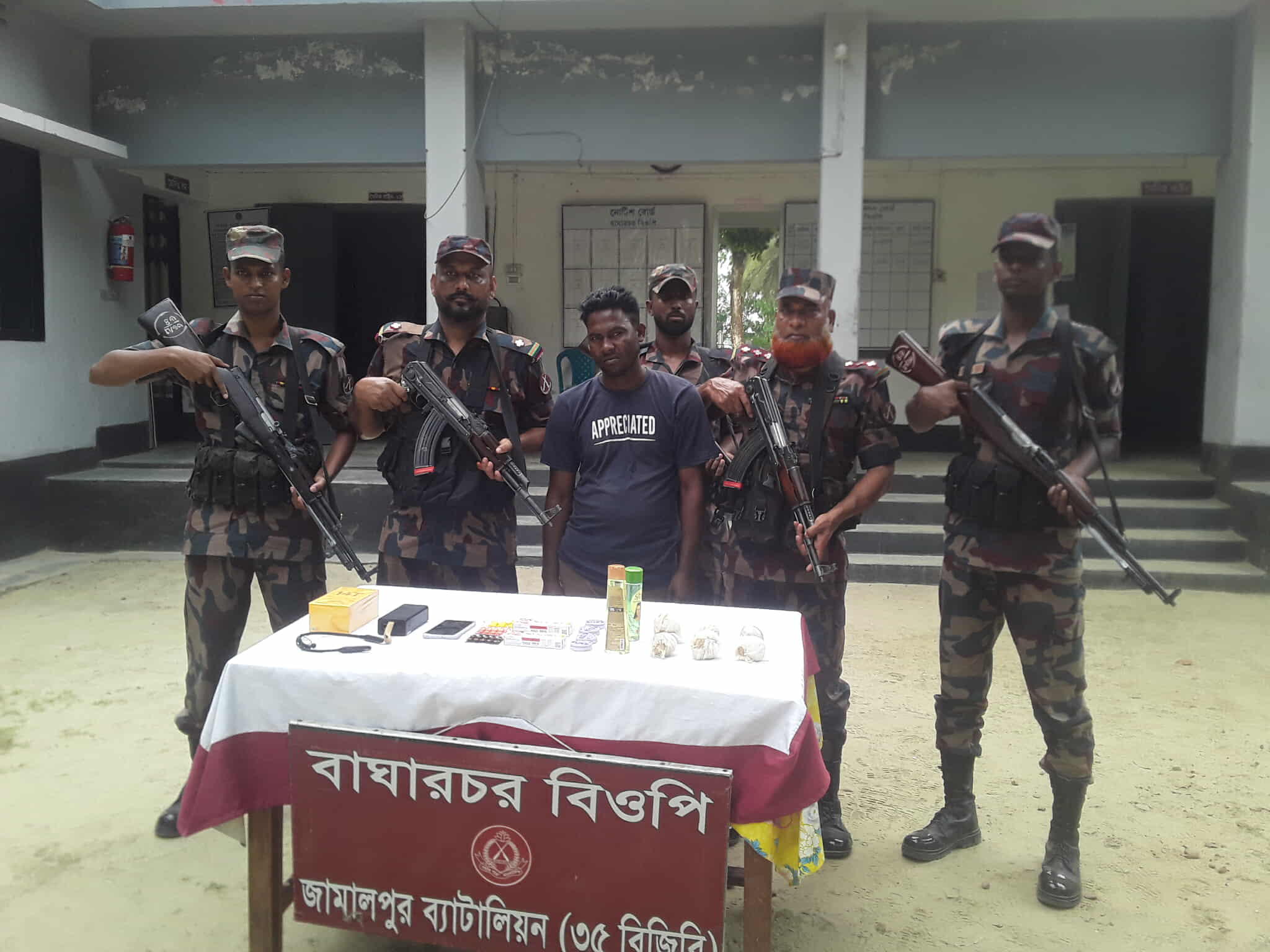 ৫ মে সোমবার ২০২৫ জামালপুর ব্যাটেলিয়ান ৩৫ বিজিবি অধিনায়ক লেঃকর্নেল হাসানুর রহমান, পিএসসি এর সার্বিক দিক নির্দেশনায় সকাল ০৯:০৫ মিনিটে নিজস্ব গোয়েন্দা তথ্যের ভিত্তিতে চোরাচালান বিরোধী অভিযান পরিচালনাকালে জামালপুর ব্যাটালিয়নের ৩৫ বিজিবি অধীনস্থ বাঘারচর টহল দল কর্তৃক সীমান্ত পিলার ১০৭৪ /৯ হতে আনুমানিক ২০ গজ বাংলাদেশে অভ্যন্তরে দক্ষিণ মাখনেরচর নামক স্থানে হইতে ভারতীয় হরিণের কস্তুরী -০৬ পিস (২৫৪ গ্রাম), ভারতীয় বিভিন্ন প্রকার প্রসাধনী-০৮ পিস, বিভিন্ন প্রকার ওষুধ -২৮ পিস, মোবাইল -০১ টি, মোবাইলের চার্জার -০১টি সিম কার্ড -০১টি,পাওয়ার ব্যাংক-০১টি এবং হেট ফোন ০১ টি হয়েছে।
