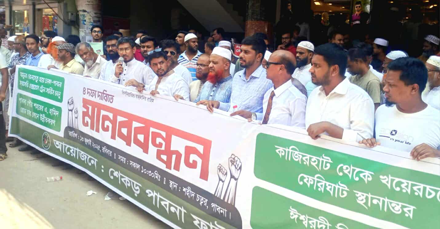রোববার সকাল ১১ টা থেকে ঘন্টাব্যাপী পাবনা শহরের আব্দুল হামিদ সড়কের শহীদ চত্ত্বর থেকে পুরো শহরজুড়ে বিশাল মানববন্ধন অনুষ্ঠিত হয়।
