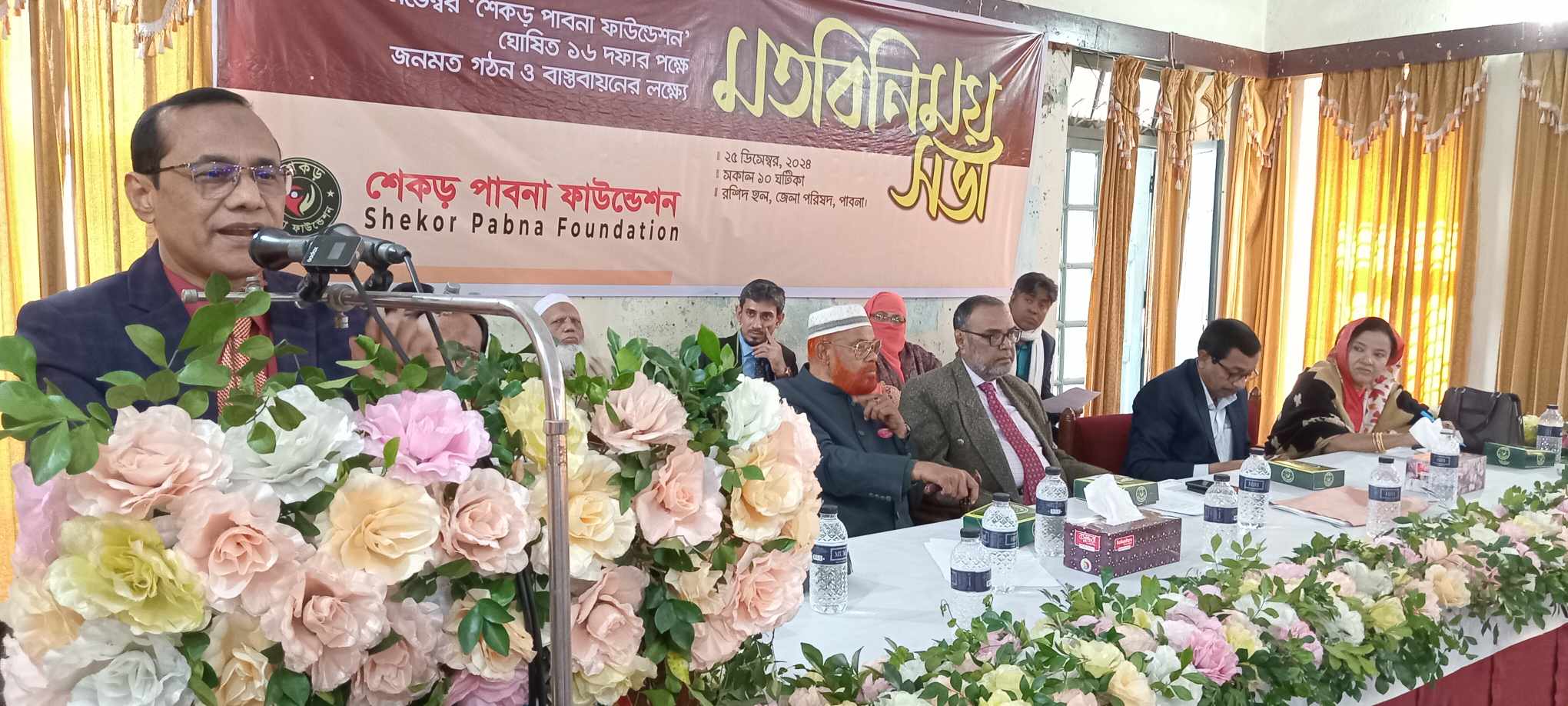 বক্তারা অবিলম্বে পাবনা থেকে ঢাকায় সরাসরি ট্রেন যোগাযোগ চালু করা, বন্ধ হয়ে যাওয়া ঈশ্বরদী বিমানবন্দর চালু করা, কাজিরহাটে ওয়াই টাইপ সেতু নির্মাণ, একটি কৃষি বিশ্ববিদ্যালয় প্রতিষ্ঠা করাসহ ১৬ দফা দাবি সরকারকে বাস্তবায়ন করতে হবে। পাবনার উন্নয়ন মানেই উত্তরবঙ্গের উন্নয়ন। পাবনার উন্নয়ন সাধন করাই দেশের উন্নয়ন। উন্নয়নের সম্ভাবনাকে এখন কাজে লাগাতে হবে। দুর্নীতিমুক্ত পাবনার সকল উন্নয়ন কাজ করতে হবে।