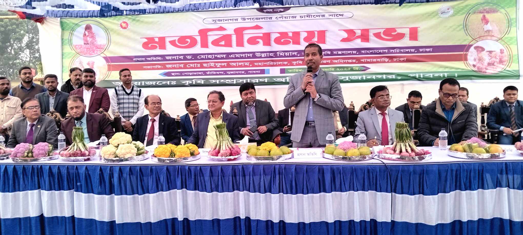হয়। তিনি আরো বলেন,সারা দেশ ঘুরে ঘুরে দেখছি, আমরা একটা খামারী অ্যাপস করবো,আগামী পঁচিশ বছরের জন্য। কৃষকের ফসলের যেকোনো সমস্যায় ছবি তুলে পাঠালেই,ঢাকা থেকে পরামর্শ দেওয়া হবে। কোন ধরণের পেঁয়াজ কি রকম হবে, শীতকালীন ও মুড়ি পেঁয়াজ কেমন হয় এগুলো আমরা সব হিসেব করে,সেই অনুযায়ী প্রণোদনা দেবো। খাদ্য ভান্ডার হিসেবে আপনাদের কাছে আমরা কৃতজ্ঞ। ইতিমধ্যে আমরা বিদেশ থেকে পেঁয়াজ আমদানি বন্ধ করতে বলেছি।সুজানগর উপজেলার পেঁয়াজ চাষীদের সাথে মতবিনিময় সভায় এ কথা বলেন, কৃষি মন্ত্রণালয়ের সচিব ড. মোহাম্মদ এমদাদ উল্লাহ মিয়ান। উপজেলা কৃষি সম্প্রসারণ অধিদপ্তরের আয়োজনে, সুজানগর উপজেলার পেঁয়াজ চাষীদের সাথে কৃষি মন্ত্রণালয়ের সচিব ড. মোহাম্মদ এমদাদ উল্লাহ মিয়ান এর মতবিনিময় সভা অনুষ্ঠিত হয়েছে।বৃহস্পতিবার দুপুরে পাবনার সুজানগর উপজেলার তাঁতীবন্দ ইউনিয়নের পোড়াডাঙ্গা হাজী এজেম উদ্দিন উচ্চ বিদ্যালয় মাঠে পেঁয়াজ চাষীদের সাথে মতবিনিময় সভা অনুষ্ঠিত হয়।মতবিনিময় সভায় প্রধান অতিথির বক্তব্যে রাখেন,কৃষি মন্ত্রণালয়ের সচিব ড. মোহাম্মদ এমদাদ উল্লাহ মিয়ান। ঢাকার কৃষি সম্প্রসারণ অধিদপ্তর খামারবাড়ির মহাপরিচালক ছাইফুল আলমের সভাপতিত্বে আরো বক্তব্য রাখেন, পাবনা জেলা কৃষি সম্প্রসারণ অধিদপ্তর খামারবাড়ির উপ-পরিচালক ড. জামাল উদ্দিন। স্বাগত বক্তব্য রাখেন,উপজেলা নির্বাহী অফিসার মীর রাশেদুজ্জামান রাশেদ ও উপজেলা বিএনপির সদস্যসচিব শেখ আব্দুর রউফ।অনুষ্ঠান সঞ্চালনা করেন,উপজেলা কৃষি অফিসার কৃষিবিদ রাফিউল ইসলাম।মতবিনিময় সভার পূর্বে আধুনিক প্রযুক্তি (এয়ার ফ্লো) এর মাধ্যমে পেঁয়াজ সংরক্ষণ পদ্ধতি পরিদর্শন করেন, কৃষি মন্ত্রণালয়ের সচিব ড. মোহাম্মদ এমদাদ উল্লাহ মিয়ান।