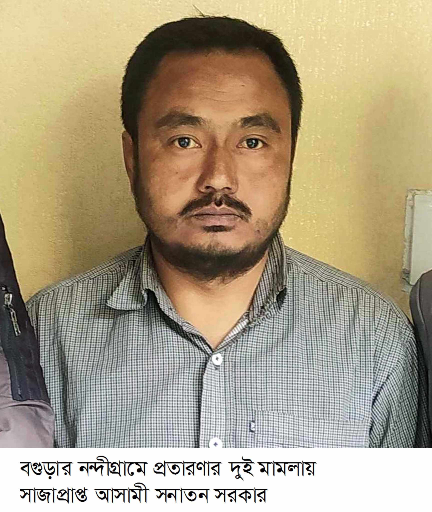বগুড়ায় গত ৪ঠা ফেব্রুয়ারি রবিবার নন্দীগ্রাম উপজেলায় অর্থ আত্মসাতের দুই মামলায় দেড় বছরের সাজাপ্রাপ্ত পলাতক আসামী সনাতন সরকারকে (৪২) গ্রেফতার করেছে থানা পুলিশ। তিনি উপজেলার বুড়ইল দোগাছিপাড়ার নিতাই চন্দ্র সরকারের ছেলে। উক্ত পলাতক আসামীকে নিজ বাড়ি থেকে গ্রেফতার করা হয়। সনাতনের বিরুদ্ধে শেরপুর থানার পৃথক দুটি প্রতারণা মামলার একটিতে এক বছরের সাজা ৫লাখ টাকা জরিমানা ও আরেকটি মামলায় এক বছরের সাজাসহ ২০লাখ ৫০হাজার টাকা জরিমানার রায় হওয়ার পর থেকেই তিনি পলাতক ছিলেন। এবিষয়ে নন্দীগ্রাম থানার অফিসার ইনচার্জ (ওসি) এতথ্য নিশ্চিত করেন এবং জানায়,দুই মামলায় আসামী সনাতনের বিরুদ্ধে দেড় বছরের সশ্রম কারাদন্ড ও ২৫লাখ ৫০হাজার টাকা অর্থদন্ডাদেশ দিয়েছেন বিজ্ঞ আদালতের বিচারক। এরপর থেকেই তিনি আত্মগোপনে ছিলেন। গোপন তথ্যের ভিত্তিতে অভিযান চালিয়ে সাজাপ্রাপ্ত এই আসামীকে গ্রেফতার করা হয়।