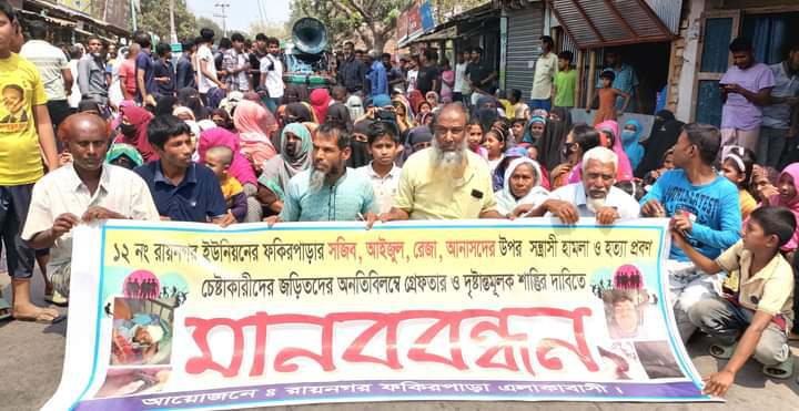 এ সময় মানববন্ধনকারীরা হামলাকারীদের বিচারের দাবীতে তিন শতাধিক নারী পুরুষ বিভিন্ন স্লোগান দিতে থাকে। এসময় ছুটে আসেন রায়নগর ইউপি চেয়ারম্যান শফিকুল ইসলাম শফি। তিনি এসে বিক্ষোভকারীদের সাথে একাত্বতা প্রকাশ করে। এসময় বিক্ষোভকারীদের উদ্দেশ্য রাখেন উপজেলা চেয়ারম্যান ফিরোজ আহমেদ রিজু। তিনি হামলাকারীদের দ্রুত আইনের আওতায় নিয়ে আসার অঙ্গীকার ব্যক্ত করেন। এসময় উপস্থিত ছিলেন ইউপি সদস্য আবু রায়হান, মানববন্ধকারীদের মধ্যে বক্তব্য রাখেন আজমল হোসেন, আইদুল হক, খাজা মিয়া, আনছার আলী, জরিল, আনিছার, সোহেল, সাথী, জেরিন, সুমিসহ অনেকে। মানববন্ধনে বক্তরা আগামী ২৪ ঘন্টার মধ্যে জড়িতদের আটক করার জন্য দাবী জানান। এবিষয়ে উপজেলা নির্বাহী কর্মকর্তা তাহমিনা আক্তার গণমাধ্যমকে বলেন, থানা অফিসার ইনচার্জকে ও ইউপি চেয়ারম্যানকে সঠিক আইনী পদক্ষেপ নেওয়ার জন্য নির্দেশ দেওয়া হয়েছে।
