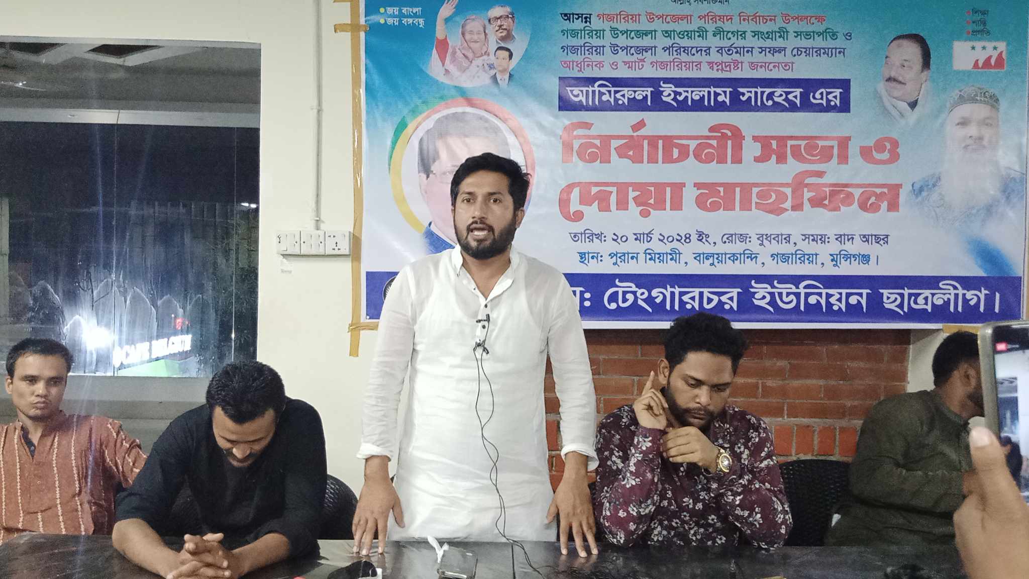 রাজু আহম্মেদ,গজারিয়া সংবাদদাতাঃমুন্সীগঞ্জ জেলার গজারিয়া উপজেলার টেংগারচর ইউনিয়ন ছাত্রলীগ এর উদ্যেগে আসন্ন গজারিয়া উপজেলা পরিষদ নির্বাচনে চেয়ারম্যান পদপ্রার্থী আমিরুল ইসলামের নির্বাচনী সভা ও দোয়া মাহফিলের আয়োজন করা হয়। বুধবার বাদ আসর বালুয়াকান্দি পুরান মায়ামী রেস্টুরেন্টে এর কনভেনশন কক্ষে নির্বাচনী সভা ও দোয়া মাহফিল অনুষ্ঠিত হয়। নির্বাচনী সভা ও দোয়া মাহফিলের টেংগারচর ইউনিয়ন ছাত্রলীগের সাধারণ সম্পাদক রাকিবুল ইসলাম রাব্বির সভাপতিত্বে এ সময় উপস্থিত ছিলেন কেন্দ্রীয় ছাত্রলীগের সাবেক উপ-গণশিক্ষা বিষয়ক সম্পাদক আশরাফুল ইসলাম জয়, গজারিয়া উপজেলা ছাত্রলীগের সভাপতি হাবিবুর রহমান হাবিব, সাবেক গ্রন্থনা ও প্রকাশনা বিষয়ক সম্পাদক সজিব খাঁন, সাবেক সহ-সভাপতি মন্জুর আলম মন্জু, সিনিয়র সহ-সভাপতি শামীম আহম্মেদ জয়, গজারিয়া উপজেলা ছাত্রলীগের, সাবেক ছাত্রলীগের ধর্মবিষয়ক সম্পাদক বিল্লাল নূর, সাবেক সহ-সভাপতি জাহিদ হাছান, সাবেক সহ-সভাপতি সাকিব আল হাছান, তিতুমীর কলেজ ছাত্রলীগের সহ-সম্পাদক ময়নুল হক নিপু, সাবেক গজারিয়া উপজেলা ছাত্রলীগের কার্যকরী সম্পাদক পারভেজ আহাম্মদ সুমন, ঢাকা পলিটেকনিক ছাত্রলীগের সাবেক সাংগঠনিক সম্পাদক রাজিব সরদার রাজু, আকাশ খাঁন রানা , প্রভাবশালী ছাত্রনেতা তাফসিরুল কোরআন শান্ত,জুনায়েদ সিদ্দিক ,রবিন,সিয়াম, হানিফ,শান্ত, ইসহাক হাসান শুভ প্রমুখ।