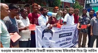বগুড়ায় আসন্ন সদর উপজেলা পরিষদ নির্বাচনে চেয়ারম্যান পদে শুভাশিস পোদ্দার লিটনকে আনারস মার্কায় ভোট দিয়ে জয়যুক্ত করার লক্ষ্যে শহরের সাতমাথা-টু-বনানী পর্যন্ত অটো ইজিবাইক দিয়ে যাত্রীদের যাতায়াতের সুবিধার্থে ফ্রি সার্ভিস চালু করেছে। গত ২৫শে মে শনিবার শেরপুর রোডের যাত্রীদের ফ্রি সার্ভিস দেবে অটো ইজিবাইক চালকরা। অটো ইজিবাইক চালকরা বলেন আমাদের বনানী রোডের চাদা বন্ধ করার পর নিজ উদ্যোগে আমরা শুভাশিস পোদ্দার লিটনকে ভালোবেসে যাত্রীদের এই ফ্রি সার্ভিস চালু করেছি। এই সার্ভিসে সকল যাত্রীরা সাতমাথা থেকে বনানী পর্যন্ত যেখানে যাবে কোন টাকা লাগবে না। আমরা ৪০টি অটো ইজিবাইক রাস্তায় নামিয়েছি। উক্ত অটো ইজিবাইক পরিষদের সভাপতি ও সাধারণ সম্পাদক সকল চালকদের নিয়ে সাতমাথায় কমার্স কলেজের সামনে সমাবেশ করে। এতে বক্তারা বলেন আমাদের যেহেতু রাস্তার চাদা বন্ধ হয়েছে তাই আগামী উপজেলা নির্বাচনে জয়ী হলে আমাদের আরো যে সমস্যা রয়েছে তা সমাধান হবে। এসময় উপস্থিত ছিলেন ইজিবাইক চালক ঐক্য পরিষদের সভাপতি শেখ এনামুল হক ডনেল,সাধারণ সম্পাদক রতন মিয়াসহ প্রমূখ।