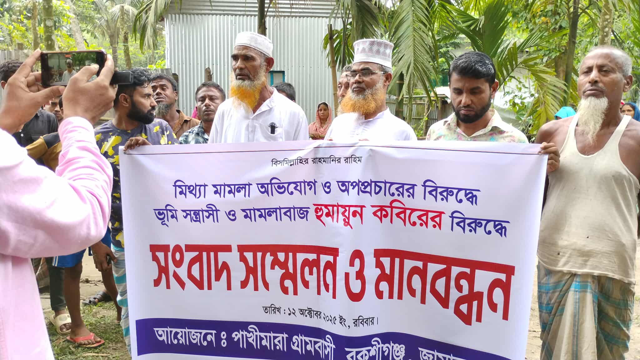 ১২ অক্টোবর ২০২৫ রবিবার সকালে জামালপুর জেলার বকশিগঞ্জ উপজেলার পাখিমারা গ্রামে মিথ্যা মামলা দিয়ে হয়রানি ও আদালতের নির্দেশ অমান্য করে বসতবাড়ি নির্মাণে বাধা দেওয়ার প্রতিবাদে পাখিমারা সড়কে মানববন্ধন ও সংবাদ সম্মেলন করে ভুক্তভোগী সবুজ মিয়ার পরিবার ও গ্রামবাসী।
