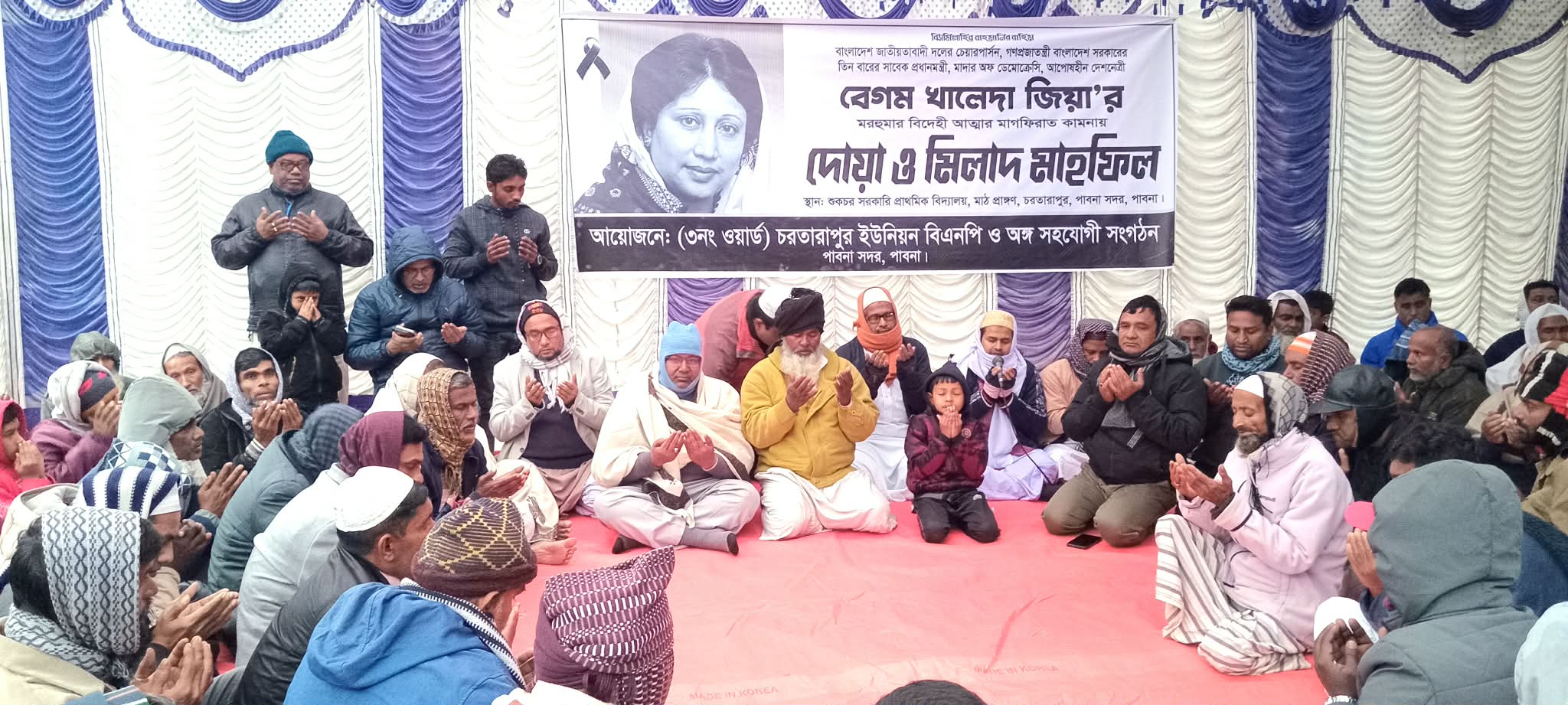 এম মনিরুজ্জামান, পাবনা: বাংলাদেশ জাতীয়তাবাদী দল বিএনপির চেয়ারপার্সন ও সাবেক প্রধানমন্ত্রী, আপসহীন দেশনেত্রী বেগম খালেদা জিয়ার রুহের মাগফেরাত কামনায় দোয়া মাহফিল অনুষ্ঠিত হয়েছে। সোমবার বিকেলে পাবনার সদর উপজেলার চরতারাপুর ইউনিয়নের ৩ নং ওয়ার্ড বিএনপির আয়োজনে, বিএনপির চেয়ারপার্সন ও সাবেক প্রধানমন্ত্রী, আপসহীন দেশনেত্রী বেগম খালেদা জিয়ার রুহের মাগফেরাত কামনায় দোয়া মাহফিল অনুষ্ঠিত হয়েছে। দোয়া ও মিলাদ মাহফিলে দেশনেত্রী বেগম খালেদা জিয়ার রাজনৈতিক জীবনের উপর স্মৃতিচারণ করে বক্তব্য রাখেন, চরতারাপুর ইউনিয়ন বিএনপির সাবেক সভাপতি ও সাবেক ইউপি চেয়ারম্যান রহমত আলী শেখ। প্রধান বক্তার বক্তব্য রাখেন, সুজানগর উপজেলা বিএনপির সদস্যসচিব শেখ আব্দুর রউফ। বিশেষ অতিথির বক্তব্য রাখেন, সুজানগর পৌর বিএনপির সাধারণ সম্পাদক জসিম উদ্দিন বিশ্বাস ও জিয়া স্মৃতি সংসদের জেলা কমিটির সাধারণ সম্পাদক ও ইউনিয়ন বিএনপির সাবেক সাধারণ সম্পাদক হাফিজুর রহমান খোকন জোয়ার্দার। চরতারাপুর ইউনিয়নের ৩ নং ওয়ার্ড বিএনপির নির্বাচনী কমিটির সভাপতি আব্দুল মান্নান বিশ্বাসের সভাপতিত্বে ও সাধারণ সম্পাদক রেজাউল মন্ডলের সঞ্চালনায় এ সময় আরো বক্তব্য রাখেন,উপজেলা স্বেচ্ছাসেবক দলের সাবেক সিনিয়র সহ-সভাপতি